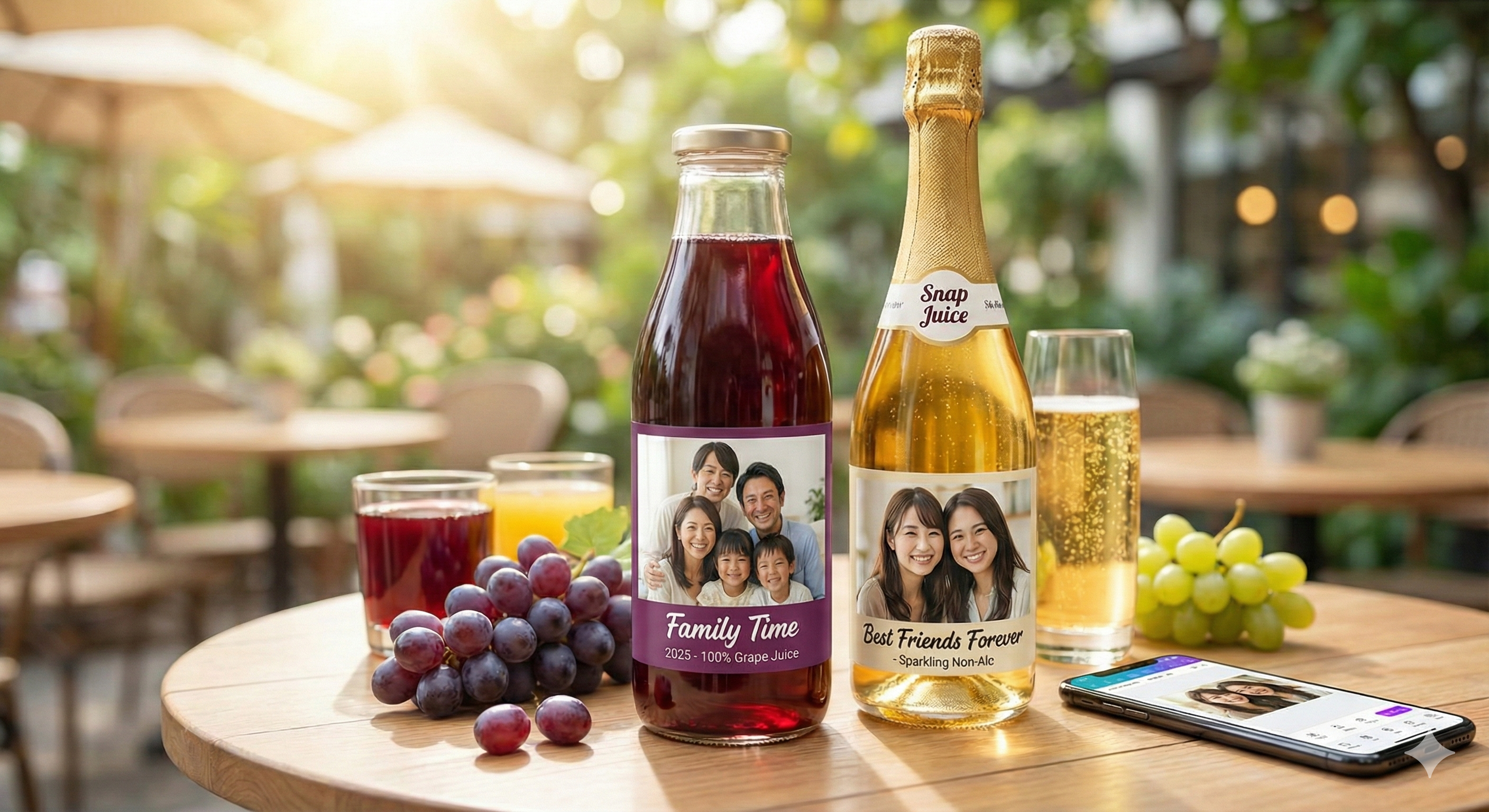 中身を「100%ぶどうジュース」や「ノンアルコール・スパークリング」から選ぶことができ、ラベルはワイン同様に自由にカスタマイズ可能です。
